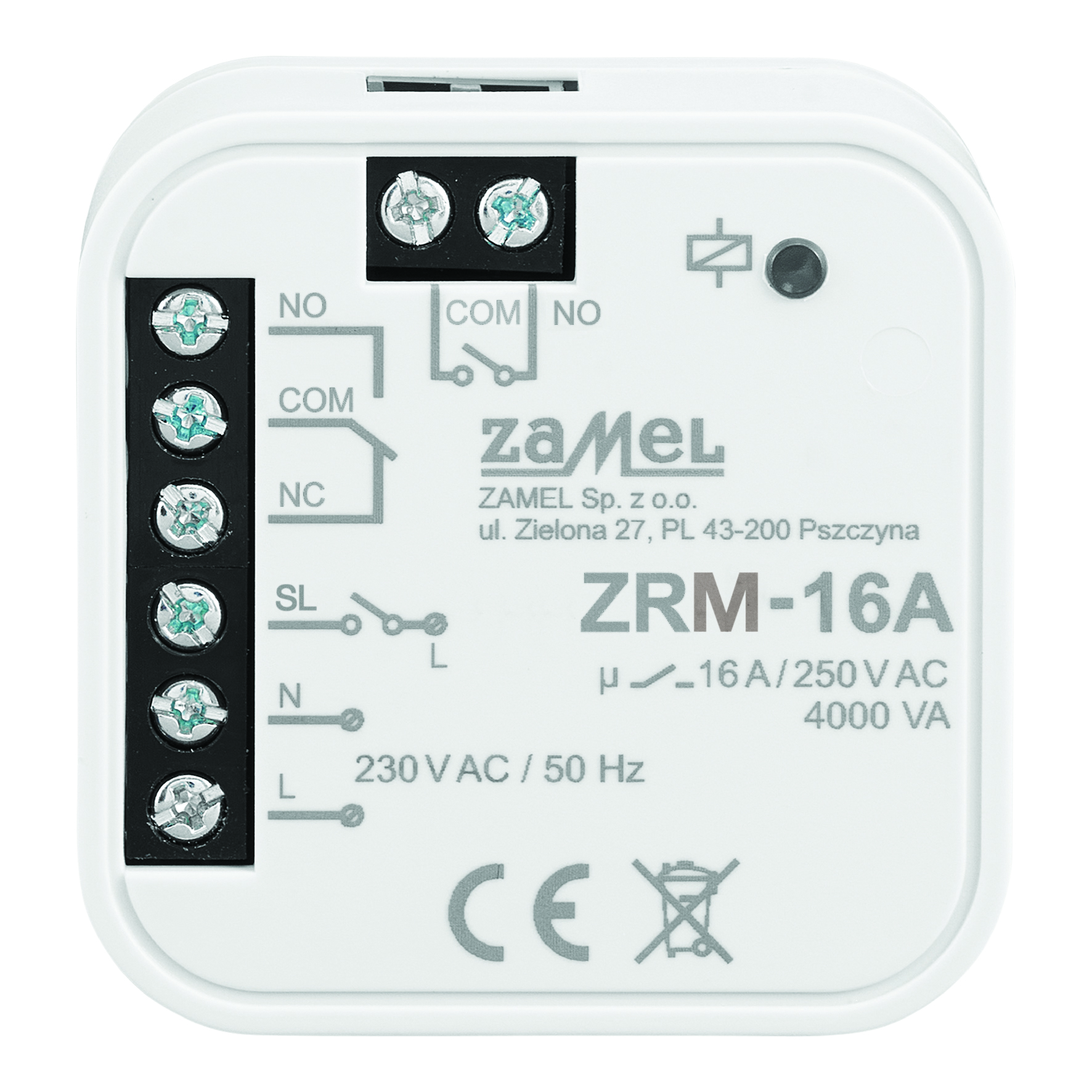 Moduł przekaźnika dopuszkowego ZRM-16A służy do włączania/ wyłączania urządzeń elektrycznych za pośrednictwem wejść bezpotencjałowych (COM/NO) oraz potencjałowych (SL) . Dzięki małym wymiarom można go zamontować w puszce instalacyjnej Ø 60. Najczęściej stosuje się go w celu zwiększenia obciążalności wyjść odbiorników do maksymalnie 16 A.
