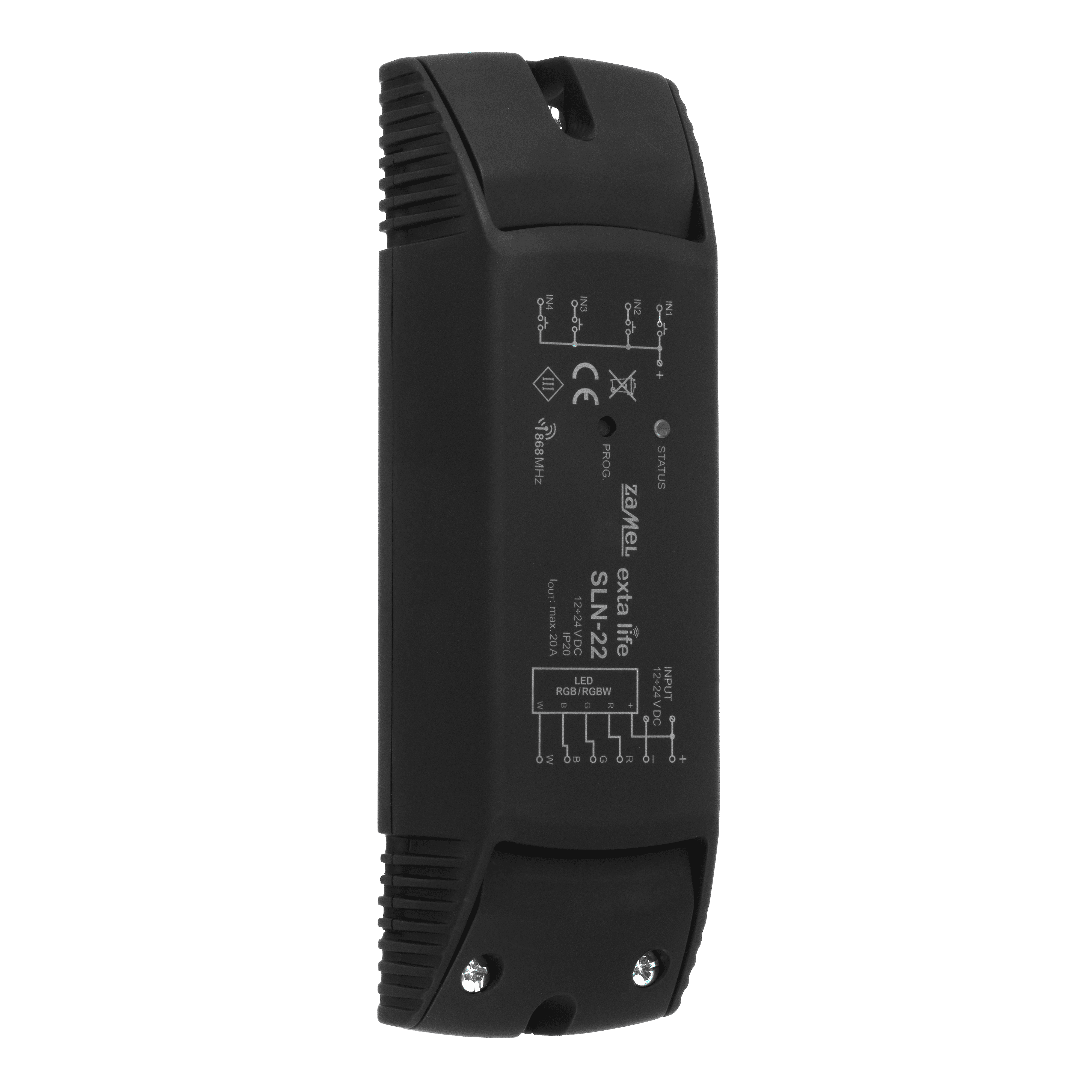 Sterownik SLN-22 to element końcowy systemu Exta Life przeznaczony do sterowania taśmami RGB lub RGBW, które zasilane są napięciem 12÷24 VDC. Wyróżnia go zwiększona obciążalność wyjść na poziomie 8A / kanał. Poza standardową funkcjonalnością jaką jest możliwość wyboru koloru oraz regulacja jasności sterownik oferuje funkcje dodatkowe takie jak tryb automatycznej, płynnej zmiany kolorów oraz zdefiniowane programy.