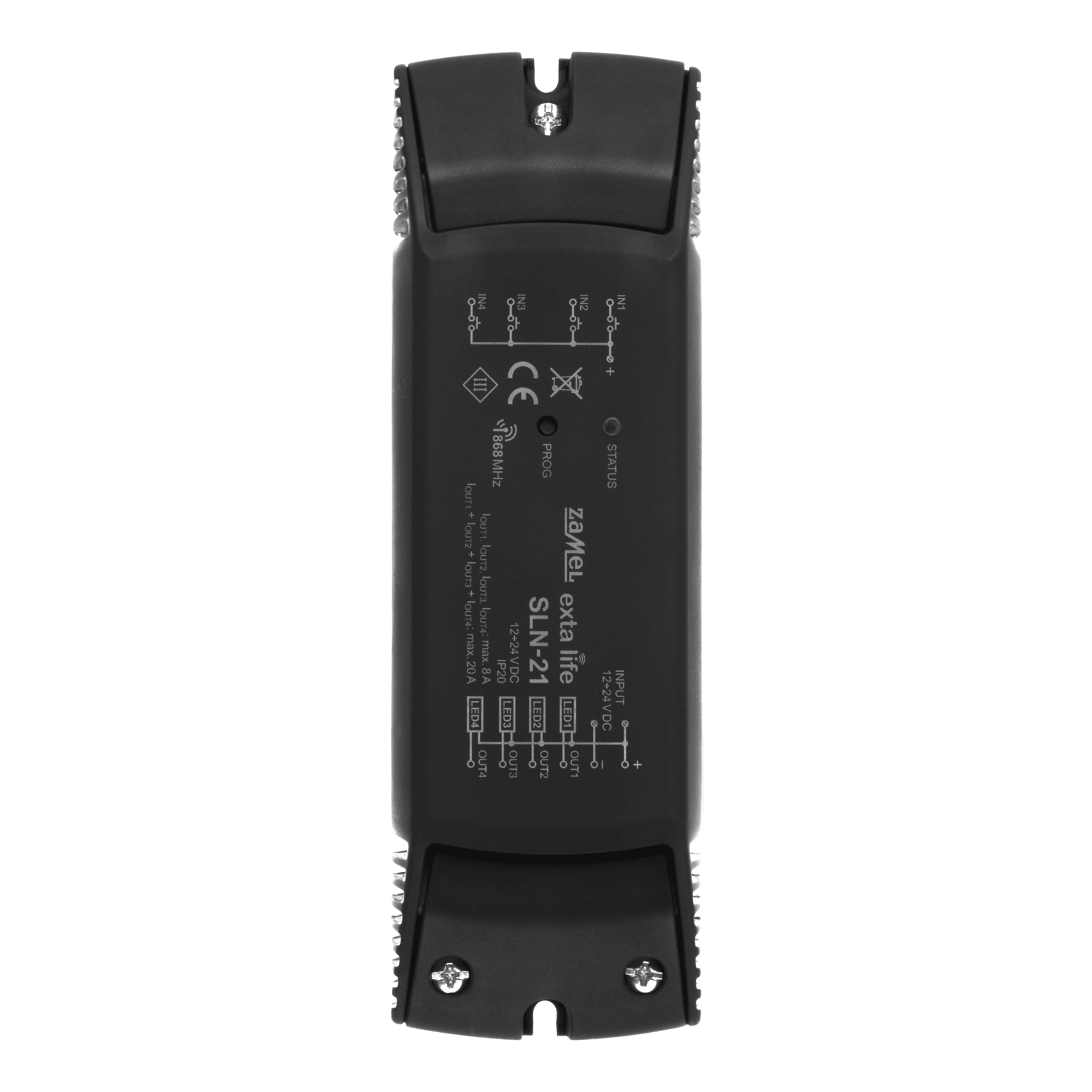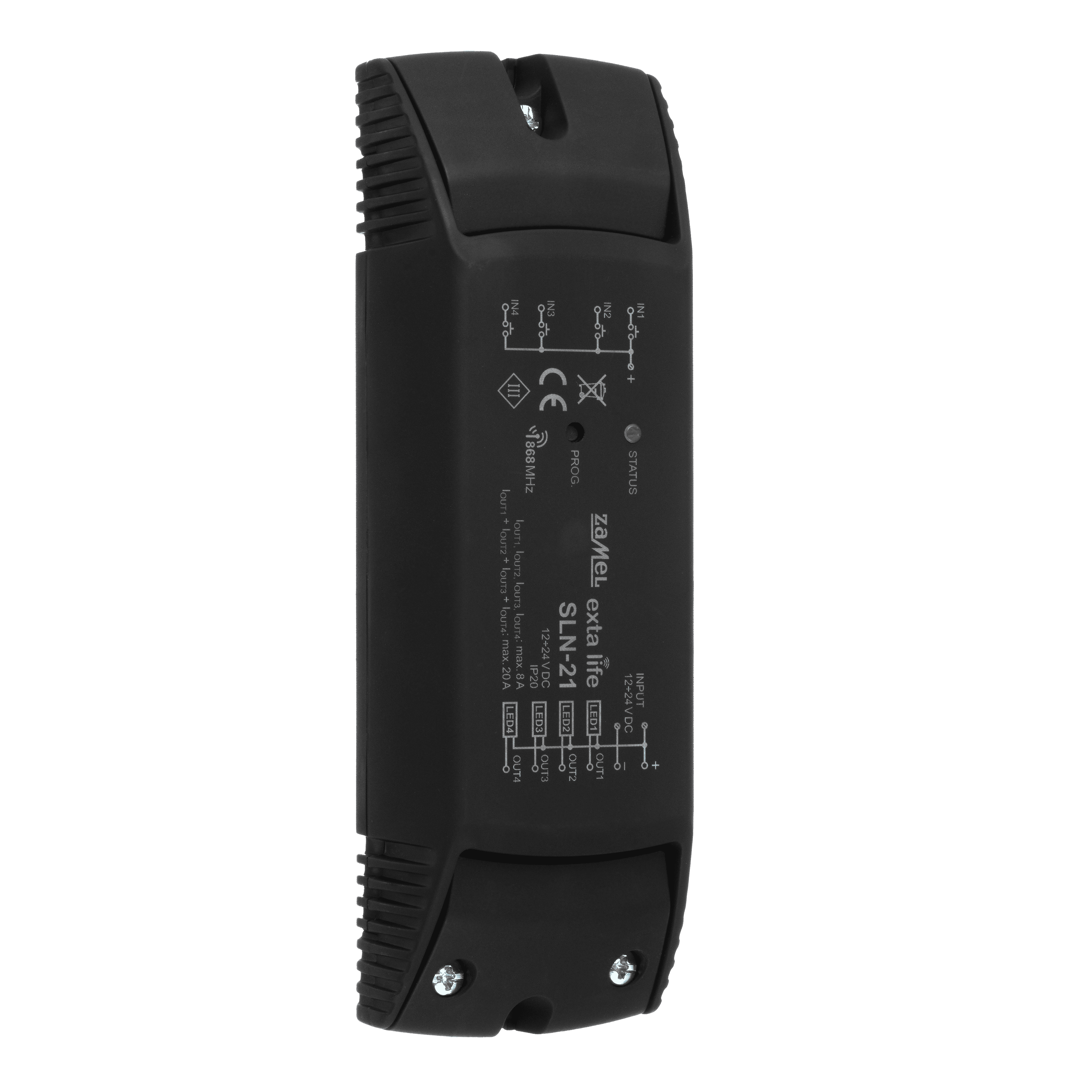 Sterownik SLN-21 to element końcowy systemu Exta Life, który umożliwia niezależne sterowanie czterema obwodami LED 12÷24 VDC. Dedykowany jest do tworzenia aranżacji świetlnych na jednokolorowych taśmach LED. Wyróżnia go zwiększona obciążalność wyjść na poziomie 8 A / kanał. Poza standardową funkcją włącz / wyłącz możliwa jest także płynna regulacja jasności w każdym kanale.