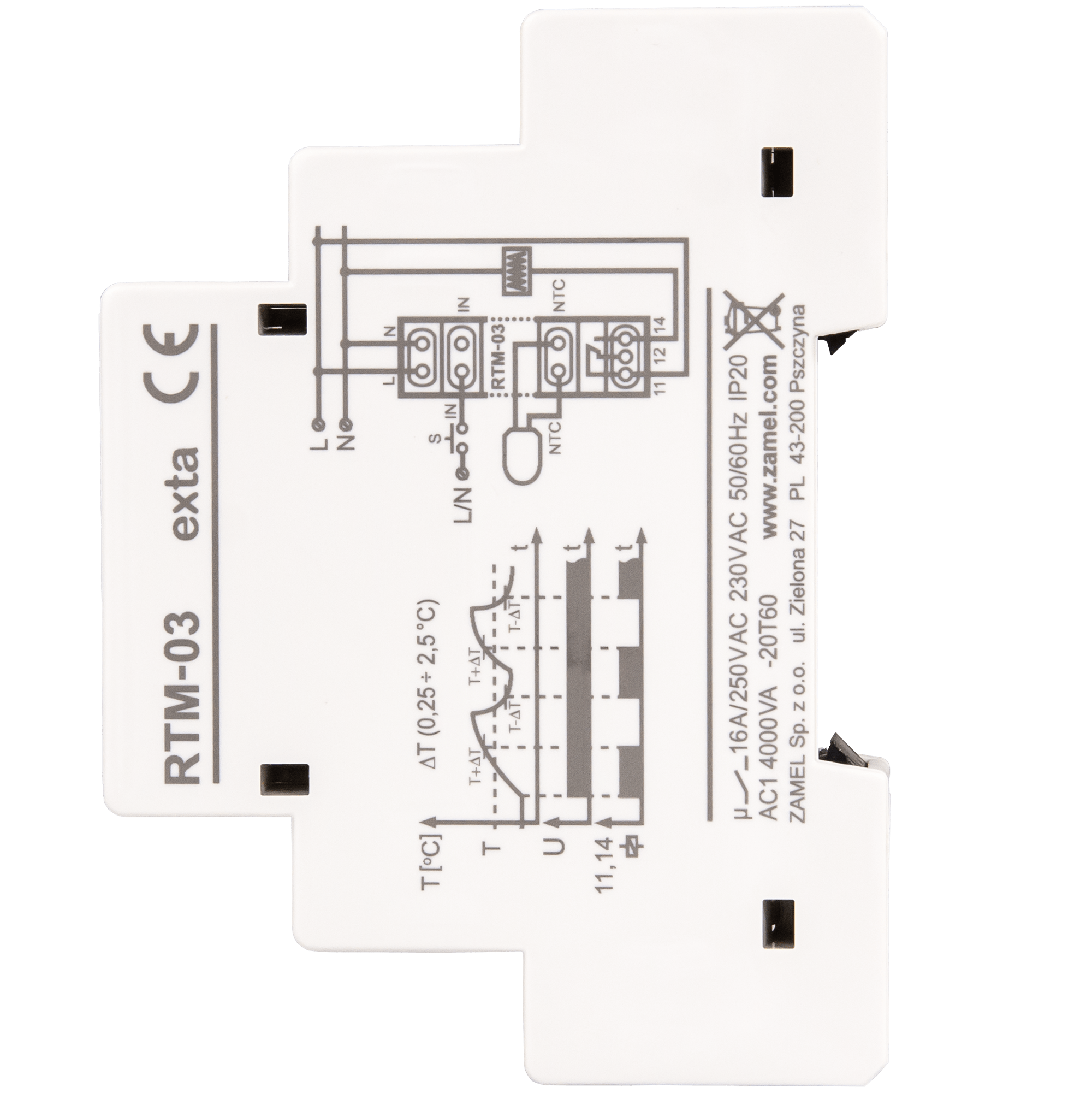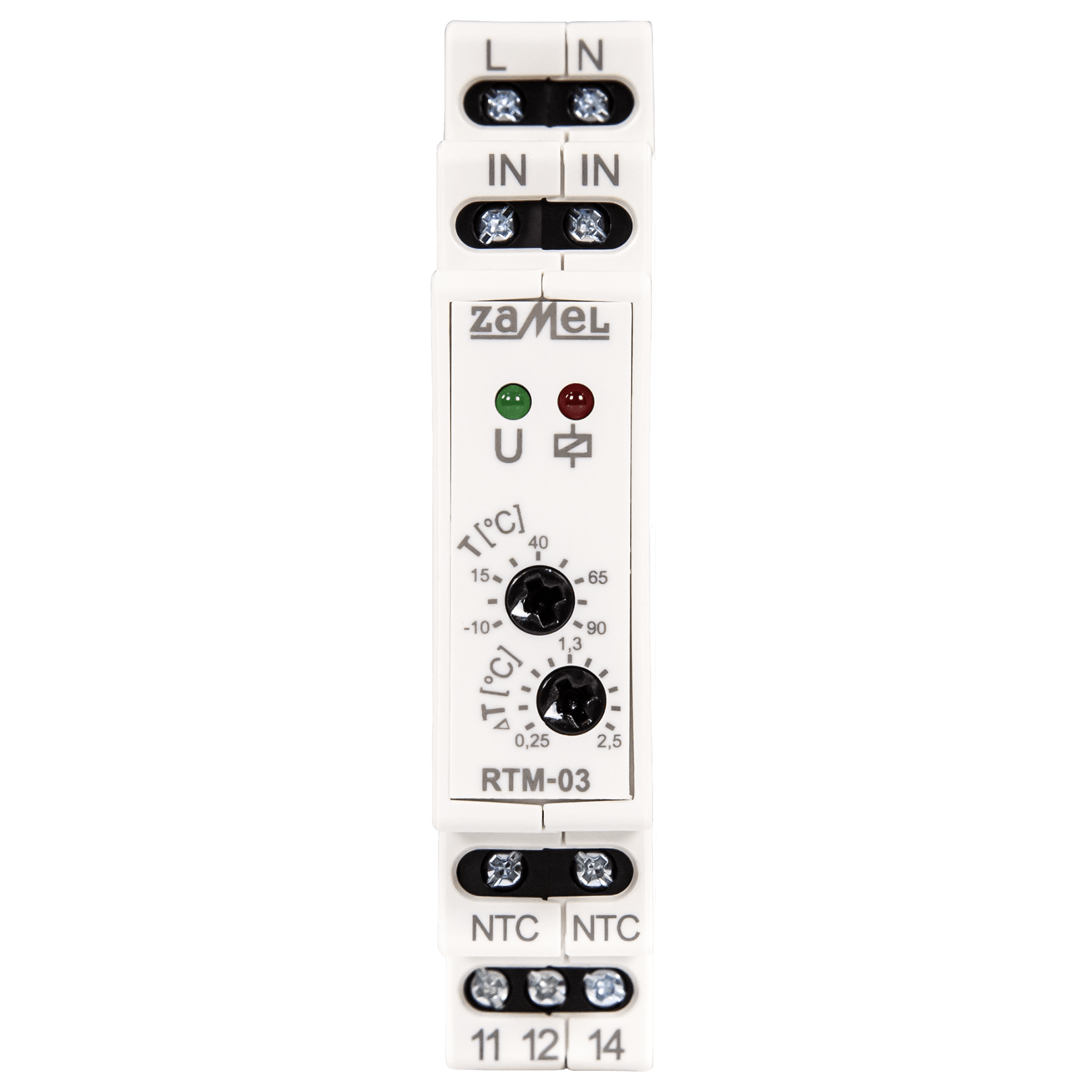 Regulator temperatury RTM-03 służy do sterowania odbiornikami (np. grzejniki, ogrzewanie podłogowe) w zależności od temperatury panującej w otoczeniu zewnętrznego czujnika NTC. Urządzenie posiada możliwość regulacji temperatury zadanej za pomocą potencjometru znajdującego się na panelu przednim w zakresie – 10 ºC ÷ + 90 ºC.